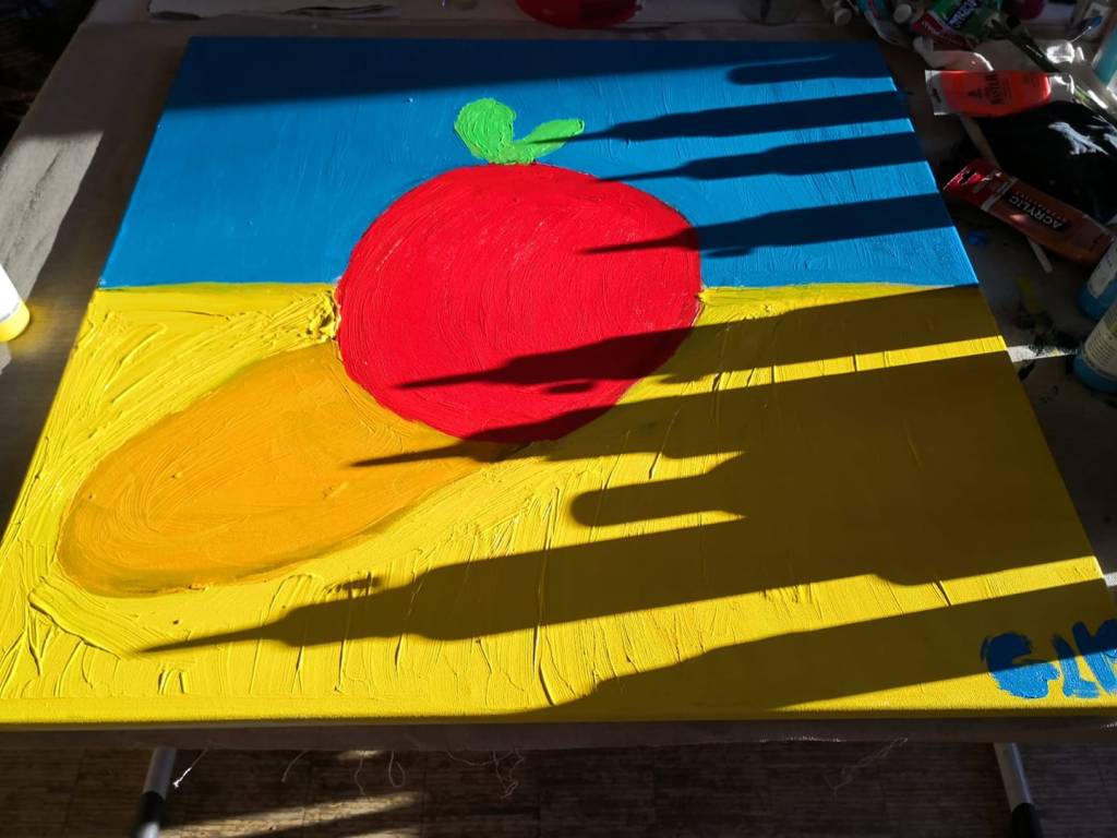 Gene Leininger, In My Head, paper collage 30×40 cm, Cologne, Barcelona, June 2023 Certificate-Expometro.pdfGene Leininger: An Apple, acrylic on canvas, 80×80 cm, Cologne 2019